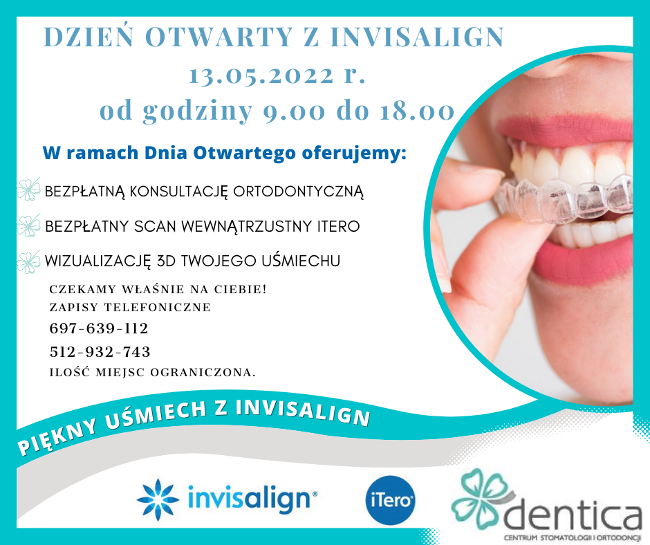 Dzień otwarty z Invisalign w dniu 13.05.2022 r. od godziny 9.00 do 18.00 Zobacz co oferujemy w ramach dnia otwartego.